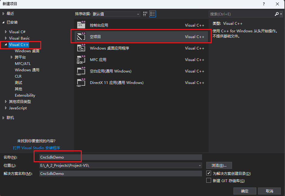 选择开发语言为“Visual C++”和程序类型“空项目 ”