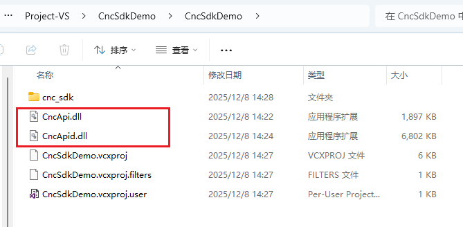 (将【{你的工程目录}\CncSdkDemo\CncSdkDemo\cnc_sdk\lib\x64】下的“CncApi.dll”和“CncApid.dll”复制到【{你的工程目录}\CncSdkDemo\CncSdkDemo\)