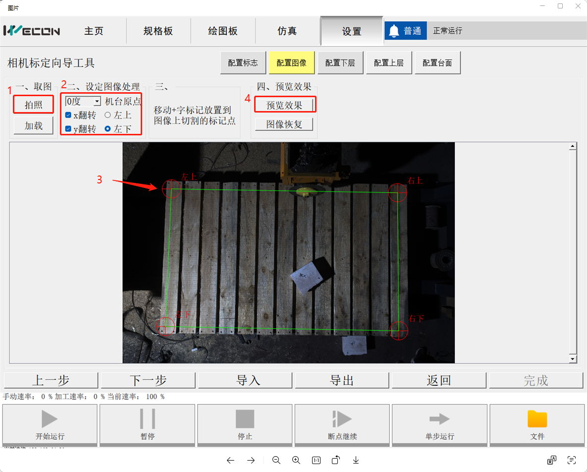 当完成下层以及上层的标定后,我们的图像校正便已经完成。由于视野不同,我们通常需要框选一个加工区域亦或者叫做对图像进行裁剪,以便于我们后续的加工。