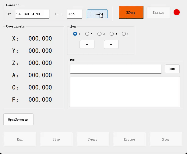 - 功能: 单步运行G代码。调用一次,执行一行。