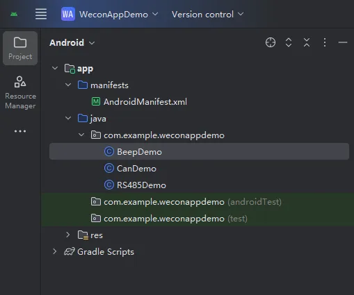 ①:成功打开WeconAppDemo 文件夹后,可以在app/java/com.example.weconappdemo路径下,可以看到蜂鸣器、CAN、串口的演示Demo。