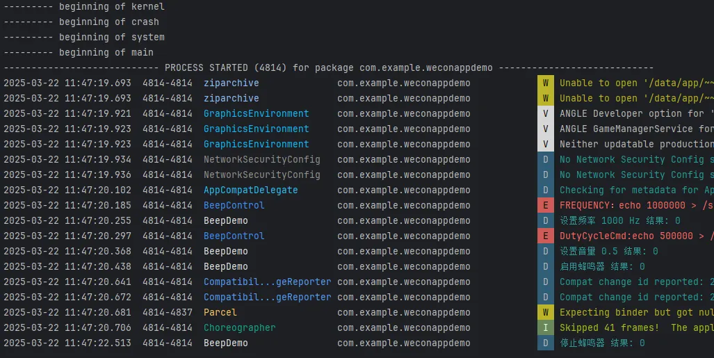 运行期间蜂鸣器状态将通过 Logcat 输出,便于开发者观察实际效果。