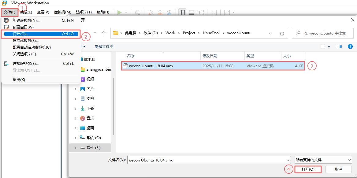 虚拟机启动流程 - 选择wecon Ubuntu 18.04.vmx文件 - 点击开启此虚拟机