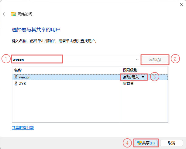 | 3 | 共享配置窗口 | 设置用户权限 | 控制读写访问 |
