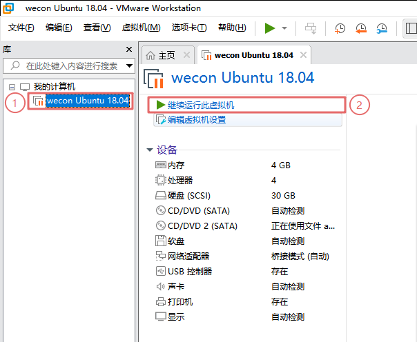 | 3 | 系统启动 | wecon Ubuntu 18.04 | 启动虚拟机系统 |