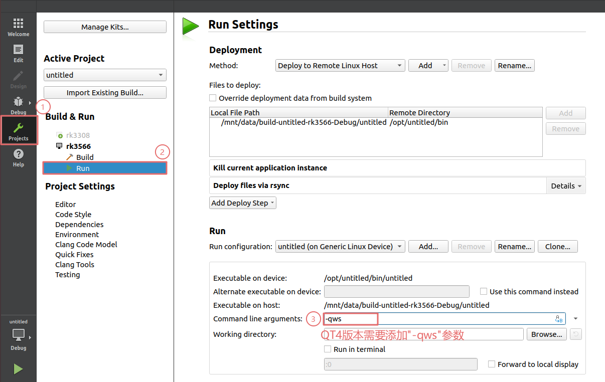 如果选择Qt4版本,需要在Projects->Run的命令行参数增加-qws。