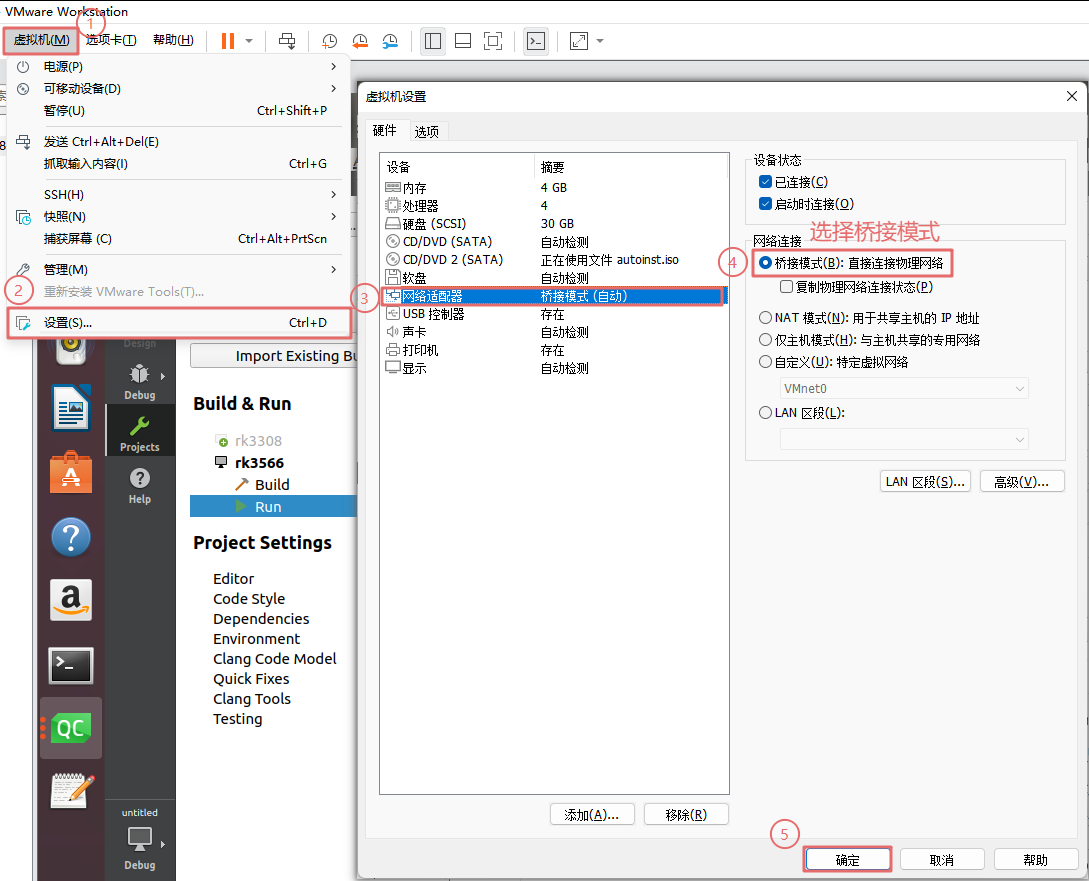 检查虚拟机网络是否正常启动,我们这里需要将虚拟机的网络桥接到物理网卡。