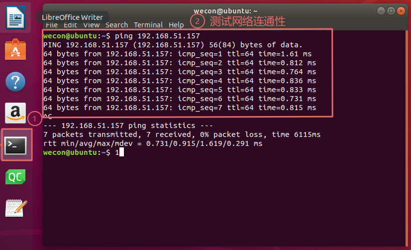 测试虚拟机和触摸屏网络是否连通,此步骤需要确保电脑和屏都处于同一个网段下。触摸屏接上网线点击获取IP可以获取到触摸屏IP,打开虚拟机中的终端【快捷键:Ctrl+Alt+T】进行ping一下触摸屏。