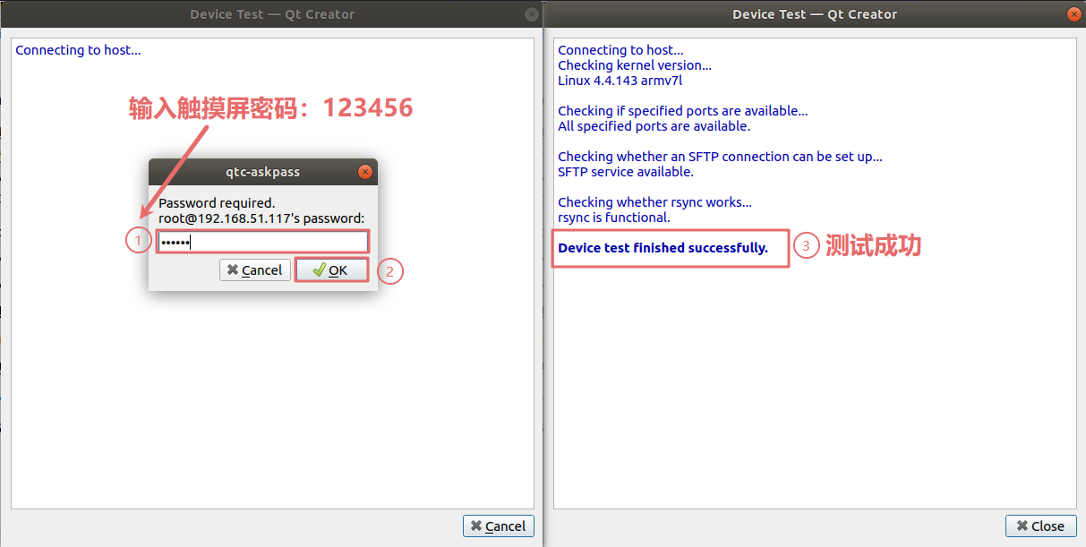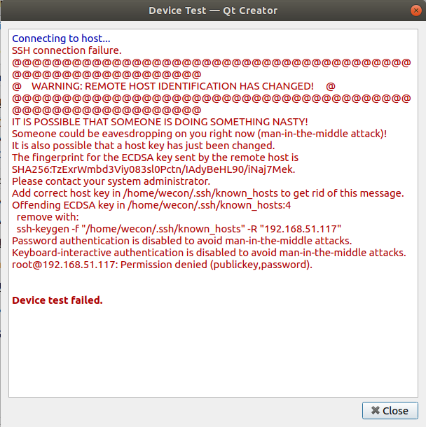 如果出现测试失败的情况,如下图所示,在终端中执行命令rm -rf /home/wecon/.ssh/*可以解决此问题。