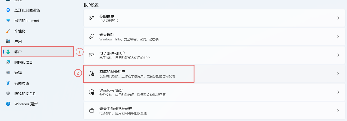按下【 Win + I 】打开设置界面,点击左侧的【账户】,选择【家庭和其他用户】。