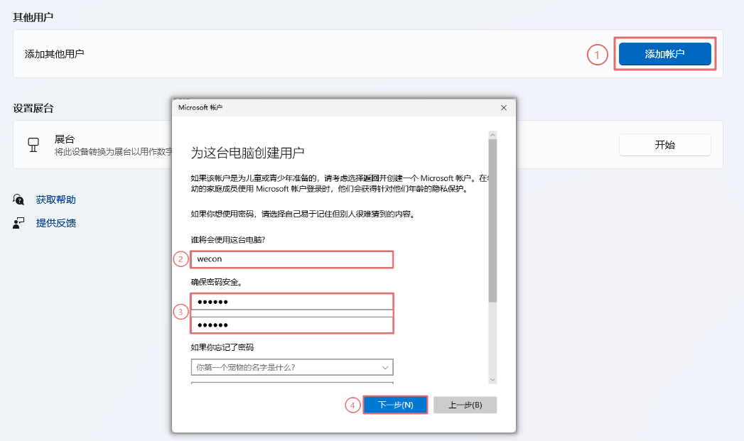 点击“其他用户”下的“添加账户”按键,在弹出的对话框中填写用户名、密码。点击【下一步】,完成用户创建。
