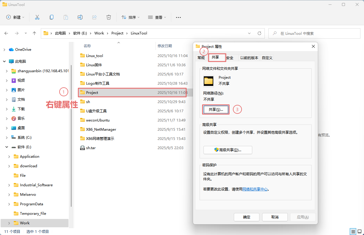 设置 windows 共享目录,选择要共享的文件夹,右键点击【属性】,选择【共享】标签,点击【共享】按钮设置共享 。